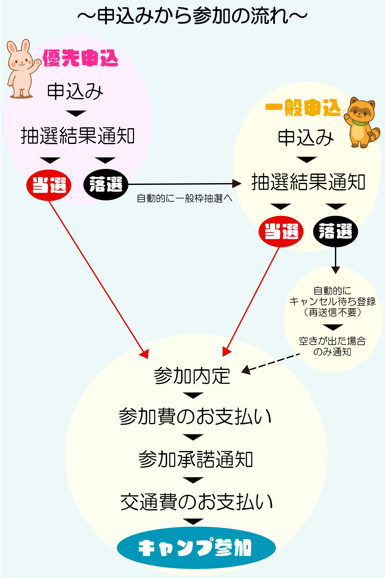 パンフレットはこちらから ※以下、募集要項は、お申込み前に必ずご確認ください。 1.名称 第22回 なみあい夏のこどもキャンプ(夏の山村留学) 2.体制 主 催:NPO法人なみあい育遊会輸送受託:(有)旅ねっと飯田 後 援:長野県教育委員会 (予定) 名古屋市教育委員会 (予定) 阿智村教育委員会 (予定) 3.コース・期間・定員・参加費 新宿発着コース ◇ぼうけんAコース期 間:7月27日~7月31日(4泊5日)定 員:20名(小学2年生~6年生)参加費:65,000円(交通費は、ラフティング時のバス代を含めて別途18,500円予定)〇はじめて1コース期 間:8月16日~8月19日(3泊4日)定 員:20名(小学1年生~6年生)参加費:56,000円(交通費は別途14,500円予定)※各コース現地集合解散 可 名古屋発着コース ◇ぼうけんBコース期 間:8月3日~8月7日(4泊5日)定 員:20名(小学2年生~6年生)参加費:65,000円(交通費は、ラフティング時のバス代を含めて別途18,500円予定)〇はじめて2コース期 間:8月19日~8月22日(3泊4日)定 員:20名(小学1年生~6年生)参加費:56,000円(交通費は別途9,000円予定)※各コース現地集合解散 可 4.集合,解散場所・交通費について 交通は旅ねっと飯田(有)が担当し、各地(新宿・名古屋)からキャンプ場までの往復バスやキャンプ中の移動のバスの手配を行います。交通の都合により、キャンプのコースごとにバス発着地を限定して開催いたします。 【現地集合,現地解散】 場 所:長野県下伊那郡阿智村1561 なみあい遊楽館 【名古屋】 場 所:名鉄バスセンター4階 時 間:コースごと「参加者向け資料」のページにて掲載致します。(6月上旬掲載予定) 移動方法:「名鉄バスセンタ~駒場」までは路線バスで移動し、「駒場~なみあい遊楽館」は貸切バスで移動します。スタッフが引率します。 交 通 費 :往復9,000円前後(人数で頭割り計算します。) ※ぼうけんコースはラフティング交通費として+4000円 【新宿】 場 所:バスタ新宿3階 時 間:コースごと「参加者向け資料」のページにて掲載致します。(6月上旬掲載予定) 移動方法:「バスタ新宿~伊賀良」までは路線バスで移動し、「伊賀良~なみあい遊楽館」は貸切バスで移動します。スタッフが引率します。 交 通 費 :往復14,500円前後(人数で頭割り計算します。) ※ぼうけんコースはラフティング交通費として+4000円 5.体調管理について 【キャンプ前】1.参加3日前から健康状態を確認し、発熱など体調が優れない場合は、必ず事務局へご報告をお願いします。2.集合解散(お迎え)時のマスクは個人判断でご使用ください。【キャンプ期間中】1.発熱や嘔吐など疑われる症状がでた場合は、原則現地までお迎えにきていただきます。2.マスクは個人判断でご使用ください。体調不良の場合や食事を作る時など必要に応じてマスクを使用する場合があります。必ず日数分ご持参ください。3.健康チェックは1日1回(朝)全体で確認し、手洗いやアルコール消毒は活動ごと行います。 6.申し込みについて 【優先申込】5月6日(水)7:31~5月13日(水)23:59まで・申込締め切り後の抽選となります。 結果は、5月20日(水)までに【内定】または【キャンセル待ち登録】のご案内をメールにて送らせていただきます。 【一般申込】6月2日(火)7:31~6月8日(火)23:59まで・申込締め切り後の抽選となります。 結果は、6月15日(月)までに【内定】または【キャンセル待ち登録】のご案内をメールにて送らせていただきます。・募集要項を全てご確認いただき、ご同意の上でお申込みください。~注意事項~・必ず連絡の取れるメールアドレス・電話番号をご入力ください。申込後に連絡が届かない場合は、メール(namiaicamp.official@gmail.com)またはお電話にてご連絡下さい。・参加費のお支払いは、「参加内定のお知らせ」から1週間以内にお願いいたします。期限内にお支払いが確認できず、メール・電話等の連絡がつかない場合は、参加の意思がないものとしてキャンセル処理させていただく場合がございます。・参加費のお支払い方法は、クレジット決済をお願いしております。 払込先等の詳細は「参加内定のお知らせ」にてご案内いたします。・キャンセル待ちに際して、男女比学年を含めて個別の順番、受付状況等についてはお答えしかねますので、ご了承ください。・1回の送信につき1名分の申し込みとなります。同じ方の名前で複数回送信があった場合は、最新の申込みデータを採用します。 7.キャンセルポリシー キャンセルのご連絡は、事務局までメールにてお願いいたします。メール受信日時がキャンセル日時となります。下記の通り、参加決定後、キャンプ開始日から起算して取消料を頂戴いたします。いずれの場合においても、返金が必要な場合は、返金手数料として500円を差し引いた金額を返金させていただきます。 ・主催者が中止と判断した場合 …キャンセル料無料。・自己都合によるキャンセルの場合 (感染症によるキャンセルも含みます。) ■キャンプ開始当日・未連絡での不参加:全額 ■キャンプ開始前日まで:半額 ■キャンプ開始7日前~2日前まで:15,000円 ■キャンプ開始14日前~8日前まで:5,000